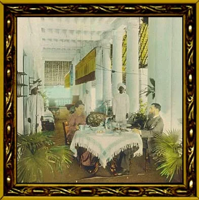 Below photo of another tourist bungalow ,with British officers enjoying the lonely life in India ,under a hand pulled cloth punkah(fan)below you can see the old "DINNER WAGON" so called kitchen cabinet of British era