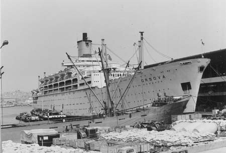 "New Australia" ex "Monarch of Bermuda", refurbished at Hamburg, 1958 (WS) | "Orsova" of 1954, P&O ex Orient Line, Piraeus 1973 (WS) |